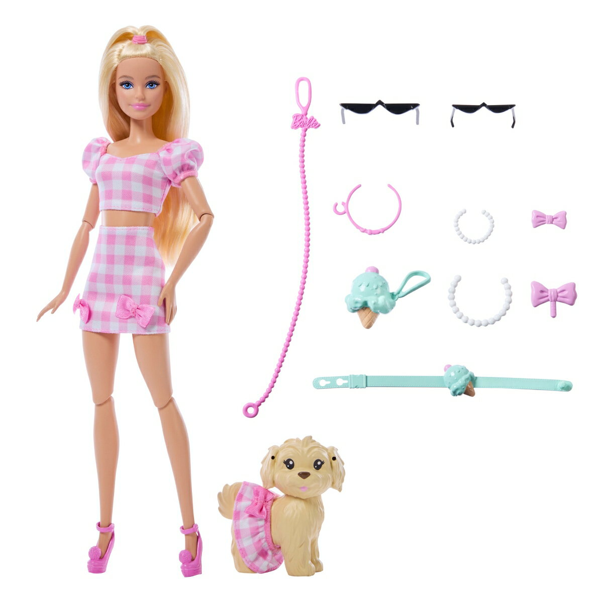 【内容】バービーとペットの子いぬは、ピンクのギンガムチェックのコーディネートでおそろい。バービーはパフスリーブとリボンがあしらわれたツーピースセットにピンクのヒールを合わせ、子いぬもリボン付きのフリルスカートでおそろいのスタイルです。 アクセサリーも2つずつセットになっているので、二人でサングラス...