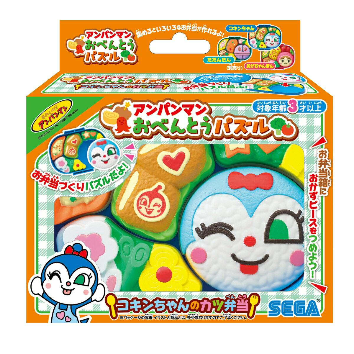 アンパンマンたちの可愛いお弁当を作っちゃおう♪形合わせが楽しいおべんとうパズル!別売りのおべんとうパズルのおかずピースと入れ替えて、オリジナル弁当を作ることもできるよ♪【対象年齢】:3才〜