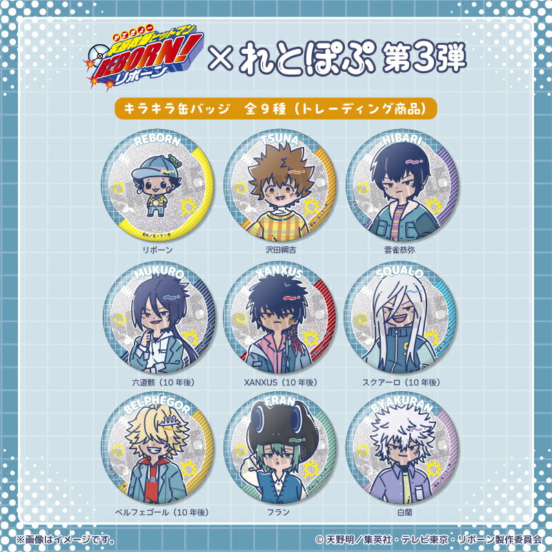 「TV アニメ『家庭教師ヒットマン REBORN!』」から れとぽぷ 第3弾 キラキラ缶バッジが登場!【対象年齢】:15歳以上【商品サイズ (cm)】(幅×高さ):5.7×5.7