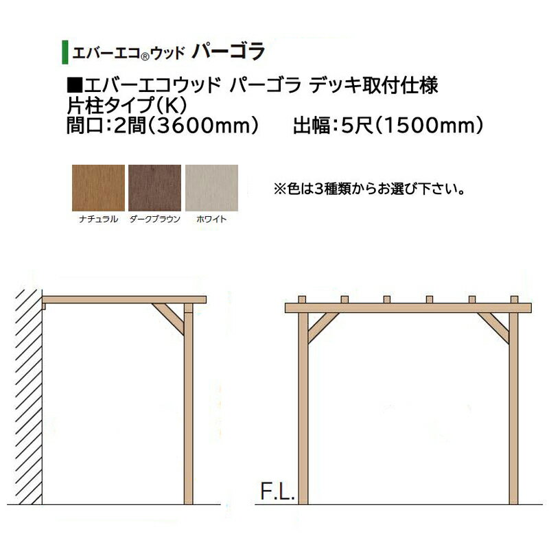 メーカー直送品のため代引き決済はできません。 北海道・沖縄・離島への送料はお見積りになります。 ■エバーエコウッド パーゴラ デッキ取付仕様 片柱タイプ(K) 間口:2間(3600mm) 出幅:5尺(1500mm) 色は以下の3色からお選び下さい。 ・ナチュラル ・ダークブラウン(受注生産) ・ホワイト(受注生産) ●プラン...