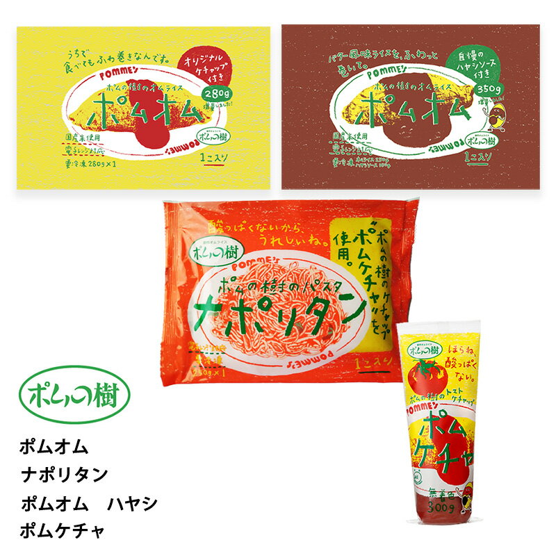 【送料無料/一部地域除く】 内容量:ポムの樹の ポムオム1袋280g×【1袋】+オムハヤシ 1袋350g×【1袋】+ナポリタン1袋250g×【1袋】+ポムケチャ300g×【1本】のセット --------------------------------------------------- 【ポムオム】ポムの樹のベーシックスタイルオムライス。 ポムの樹のオムライスの中で一番よく売れ...