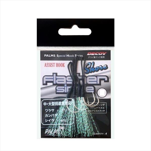 4個入り/袋 デコイ製フック使用 ショアジグ40?80gクラスに適合ライトショアジギングで狙うことができるターゲットを網羅する純正フラッシャーアシストフックです。高強度ワイヤーは強引なファイトが必要なシーンにも、安心というアドバンテージをもたらします。防錆処理を施したフックは鋭い刺さりを長時間維持。ハード...