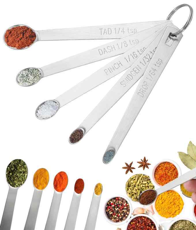 計量スプーン メジャースプーン 5本セット 目盛りスプーン ステンレス鋼製 吊り下げ収納 洗濯便利 豆の計量/卵白粉/調味料/各種香料の調合 家庭の主婦や料理愛好家 食洗機対応 調理器具 (セット内容: 5 本のスプーン(小さじ 1/4、1/8、1/16、1/32、1/64)を同梱し、この計量スプーンセットはのステンレススチール製で...