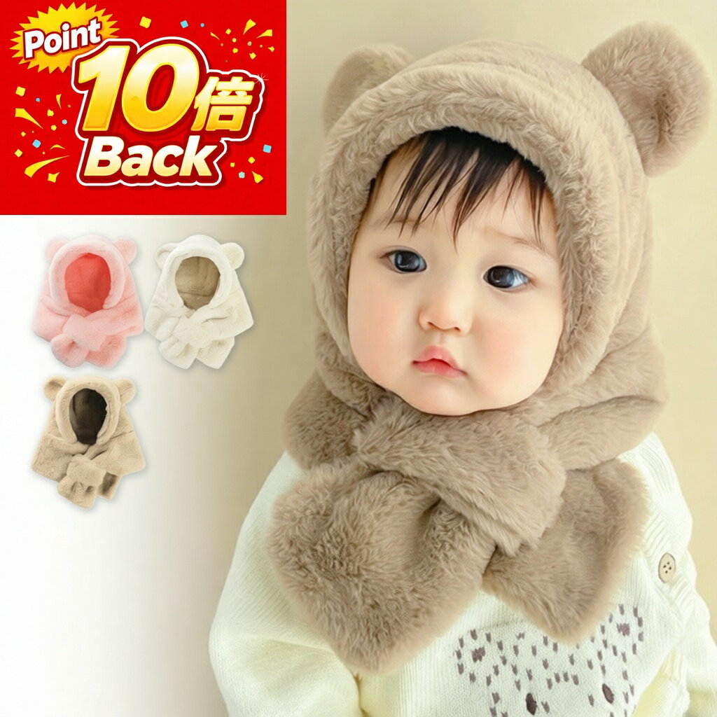 毎日のお出かけを、もっとあたたかく、もっと可愛く。 くま耳付きのフードとマフラーが一体になった、 赤ちゃんのためのふわふわ防寒アイテムです。 【ポイント1】頭・耳・首をしっかりカバー 帽子+イヤーマフ+マフラーが一体化したデザイン。 冷たい風から頭・耳・首元まで包み込み、寒い日も安心です。 【ポイント2...