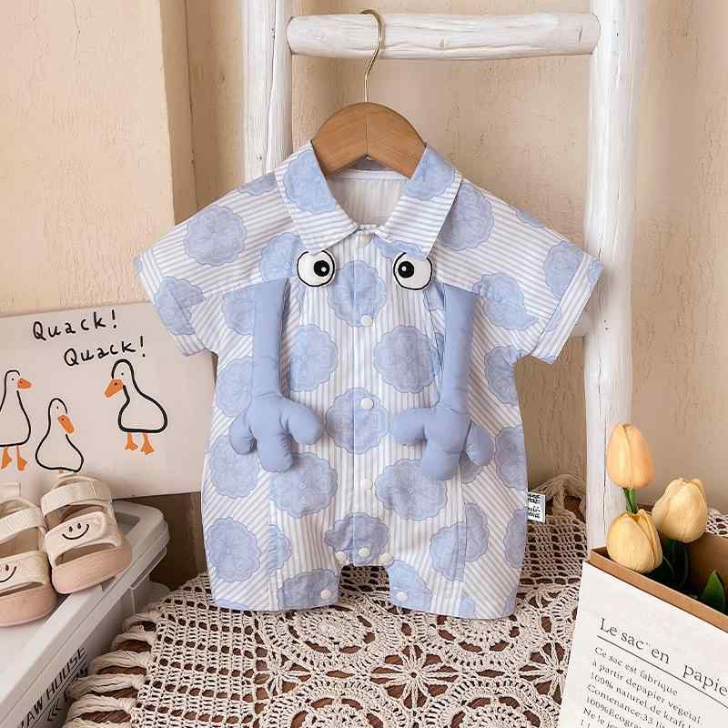 ・カテゴリ: ロンパース、カバーオール・スタイル: カジュアル・対象年齢: 新生児(0〜1歳)・性別: ユニセックス・主な素材: 綿95%・袖丈: 半袖・厚さ: 薄手・留め具: 前ボタン・安全基準: Aクラス・カラー展開: ブルー、オレンジ・サイズ展開: 66cm、73cm、80cm、90cm、100cm