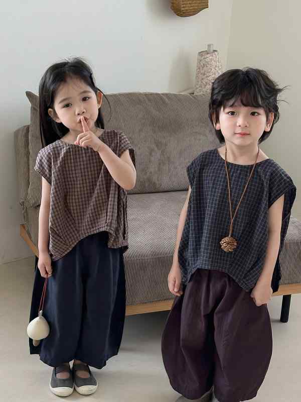 タンクトップ キッズ 男の子 ベビー 格子柄 ノースリーブ トップス 森ガール レトロ 開襟