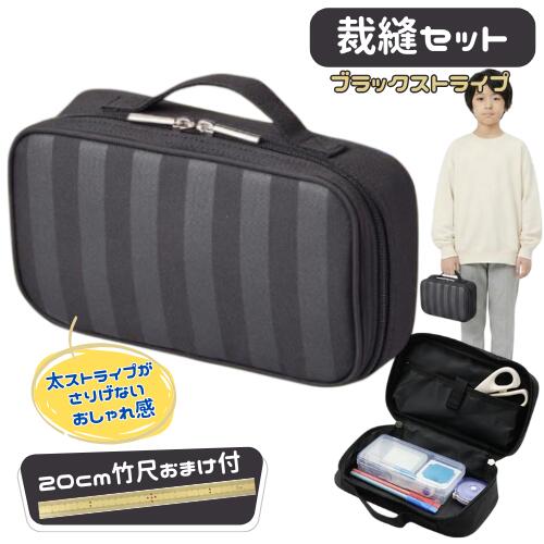 ☆裁縫セットを1セットご注文につき【竹尺20cm】を1本プレゼントいたします! ◆ブラックのストライプがシンプルでおしゃれな裁縫バッグ。 ◆シンプルで永く使えるデザイン。 ◆コンパクトでランドセルにも入る! ◆小学生から大人まで使える基本的なセットが揃っています。 ◆サイズ:約13×23×6cm ◆裁ちばさみは右用か左用...