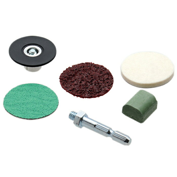 仕様 用途:アルミホイールのガリ傷修正、金属パーツのサビ、塗料剥がし、ツヤ出しの際に セット内容:ジルコニアペーパーB #60、けずる不織布B 中目、フェルトB、ミニ青棒(研磨剤)、専用ホルダー、専用軸 最高使用回転数:3,000r.p.m 番手(粒度):粗目 インパクトドライバー対応(六角軸仕様) 製品重量(g) 86 商品説明 ガリ...