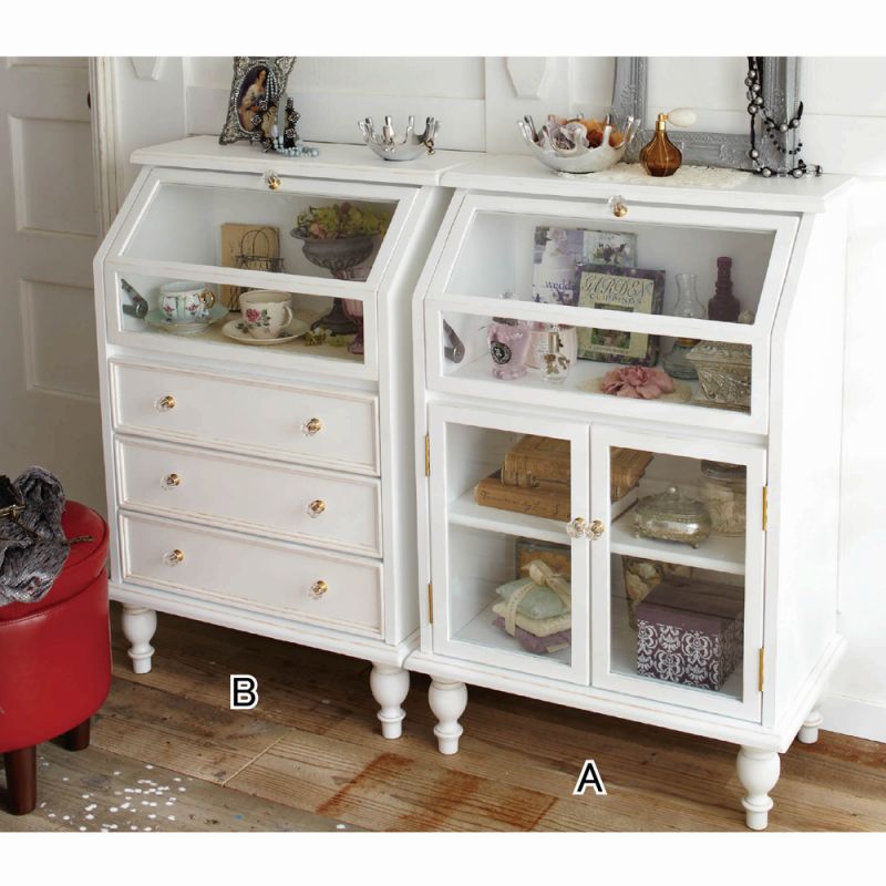 お気に入りをかわいく見せるフレンチスタイルのキャビネット傾斜のついたフラップ扉の中にお気に入りを飾ってディスプレイ収納♪ガラス扉と引き出しの2タイプがあり、天板上にも小物を飾れます。(検索用)08z203■商品サイズ/(共通)幅60・奥行35・高さ90cm〔引出内寸〕(B)幅49・奥行26・深さ10cm〔扉内内寸〕(上)幅50・奥...
