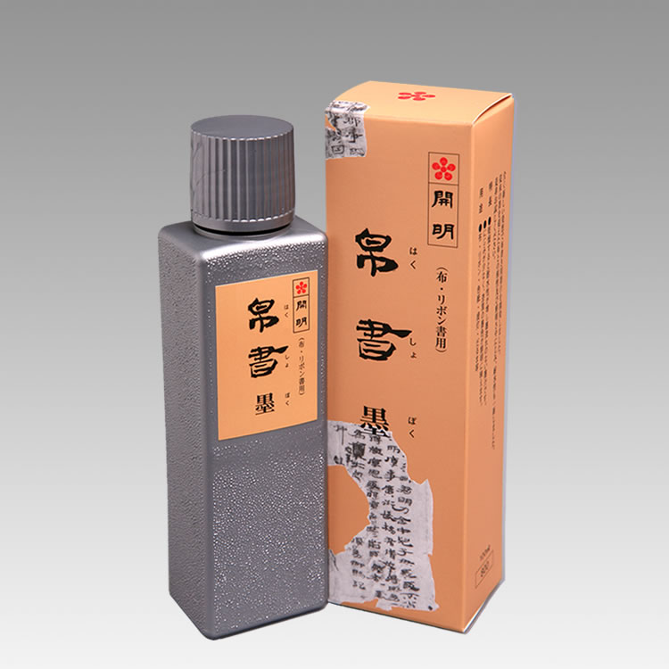 使用例 布・リボン書用の墨汁です。 (特長)・乾燥すると耐水性が増し、墨流れしない。 ・にじみが少なく、漆黒の黒色が鮮明に映える。 (用途)・布、リボン、色紙、提灯、だるま等。 (内容量)400ml開明、クレタケ、墨運堂、祥碩堂、各社の墨液をご紹介。