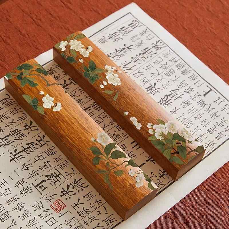 文鎮 無垢材 竹 ペーパーウェイト 花 梅 鶴 レトロ 中国風 2本セット 紙押さ...