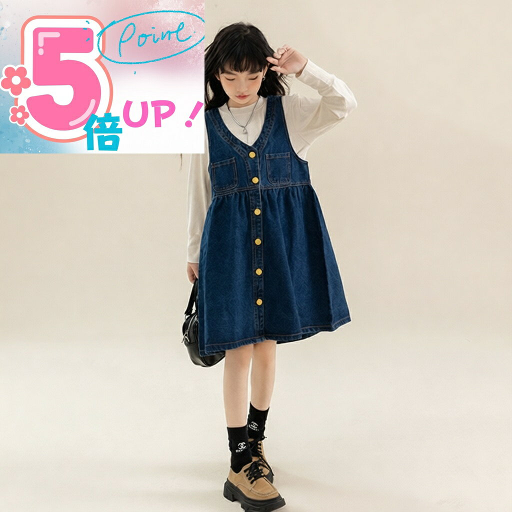 キッズ デニムサロペットスカート+長袖Tシャツ 2点セット(120〜170cm) これだけでコーデ完成♪デニムのAラインサロペットスカートと、合わせやすい長袖Tシャツの嬉しい2点セットです。ボタンデザインがアクセントになって、シンプルなのにちゃんと可愛い。通学からお出かけまで、毎日つい手に取りたくなる定番ガールズ...