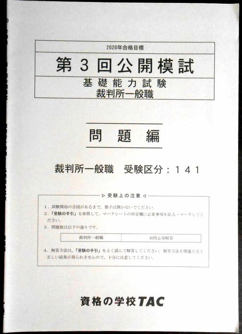 【送料無料 中古】資格の学校TAC 2020年合格目標 公務員講座 第3回公開模試 基礎能力試験 裁判所一般職 問題編。 発行所:TAC。商品サイズ:25.8x18,3 x0.3cm。45p。 【コンデション=非常に良い】解答用紙付き。中身は見た限り書き込みはありません。【送料無料 中古】資格の学校TAC 2020年合格目標 公務員講座...