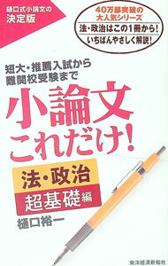 小論文これだけ! 法・政治超基礎編 単行本 の詳細 「小論文の神様」が書いた、究極の小論文参考書。法・政治系の学部の志望者向けの超入門書として、小論文の書き方から、法・政治系の小論文の特徴、合格小論文を書くのに必要な基礎知識までをやさしく解説する。 カテゴリ: 中古本 ジャンル: 女性・...
