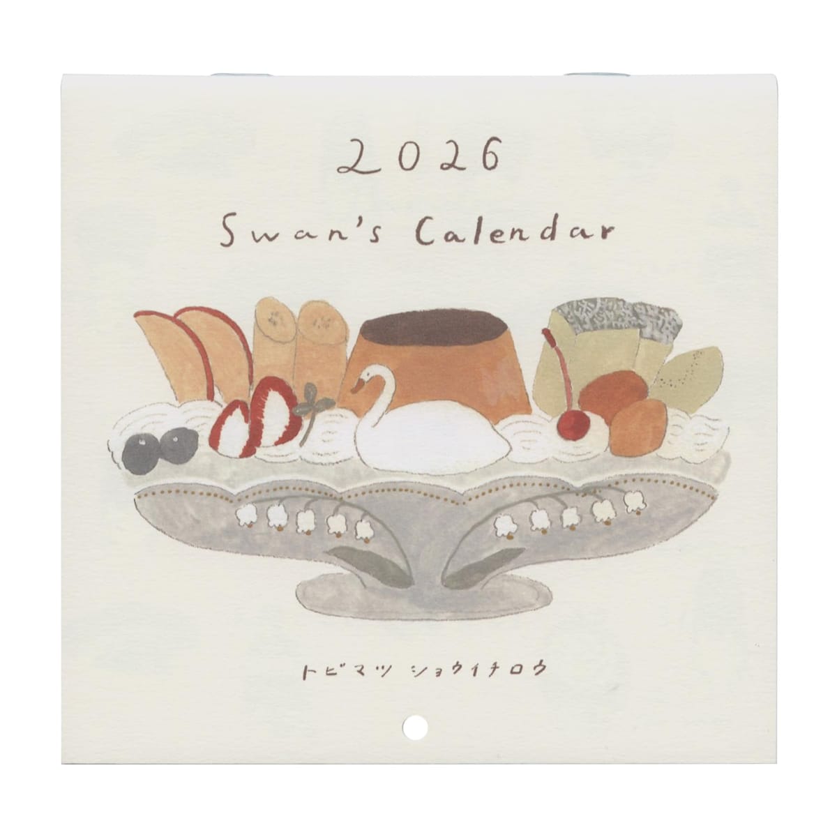 カップケーキになりきるスワンや、美容室でくつろぐスワンなど、クスッと笑える素敵な作品が楽しめます。【綴じ枚数】二つ折り28項仕様【サイズ】 145×140mm【日付期間】 2026年1月~2026年12月【原産国】日本 【仕様】日曜始まり / 六曜なし