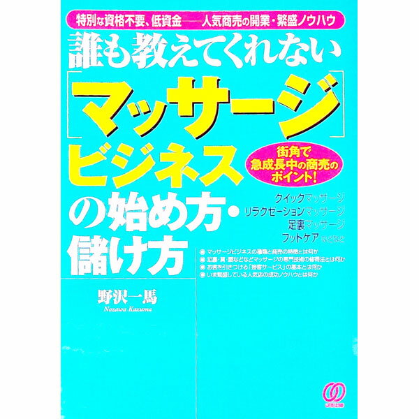誰も教えてくれない〈マッサージ〉ビジネスの始め方・儲け方−街角で急成長中の商売のポイント!− 単行本 の詳細 カテゴリ: 中古本 ジャンル: ビジネス 販売 出版社: ぱる出版 レーベル: 作者: 野沢一馬 カナ: ダレモオシエテクレナイマッサージビジネスノハジメカタモウケカタ / ノザワカズマ サイズ...