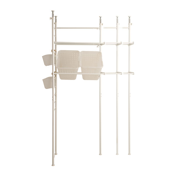 ■商品について使い易さと機能が充実したランドリーラック。通常のランドリーラックは組立ててラックを先に設置する為、洗濯機を一度移動してから、また元に戻す作業が必要になりますが、本製品は組み立てて、前から簡単に設置が出来る構造で、後ろの桟が無い為、安定感を保てるように突っ張り式にしています。国産品のし...