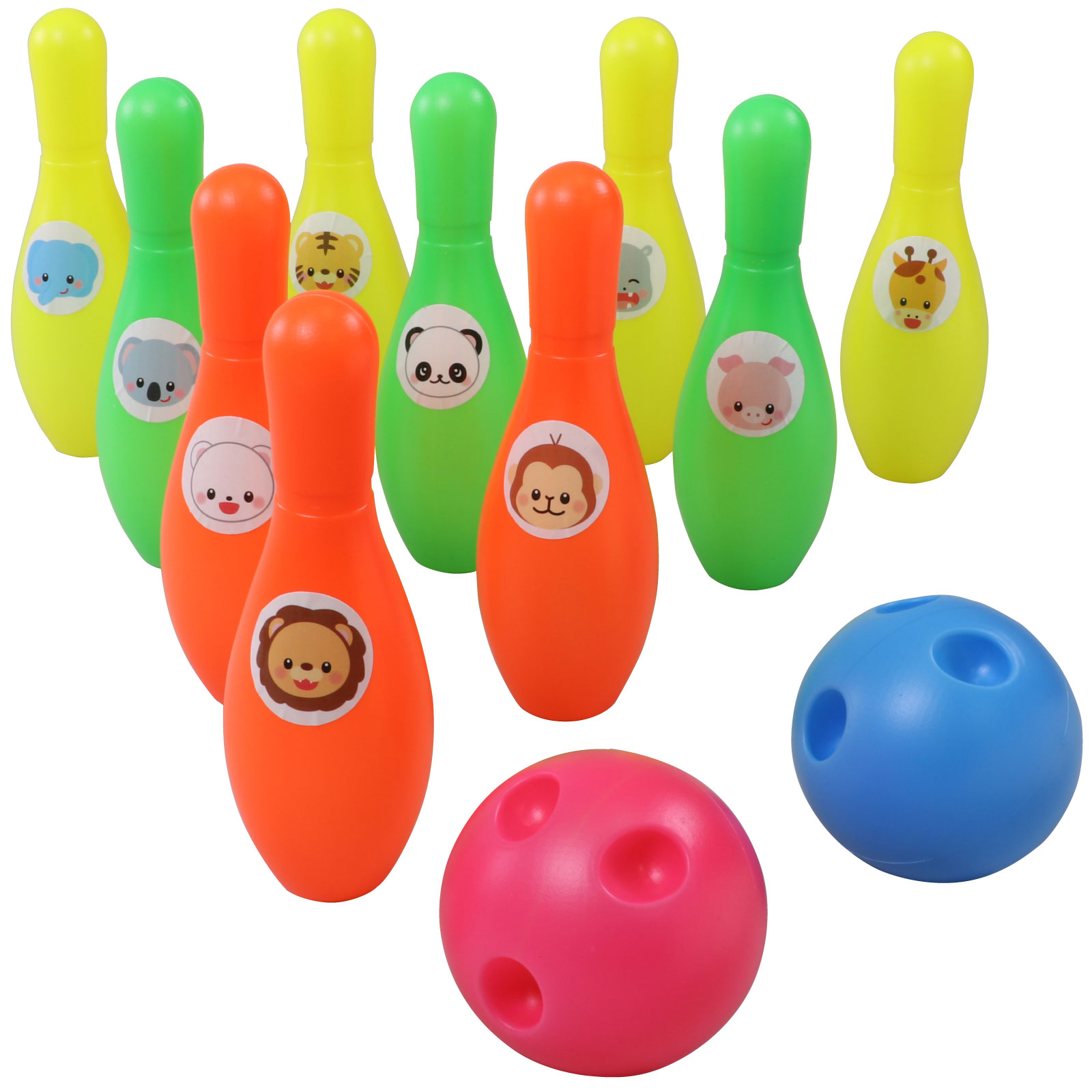 【商品説明】●かわいい動物のシールを貼ってボーリングをしよう!ピン10本とボール2個のセット●商品サイズ(単位mm):ピン:φ48×150mm、ボール:φ72mm●重量(g):118g●材質:PE●包装形態:OPP袋入●包装サイズ:250×200×90mm●生産国:中国