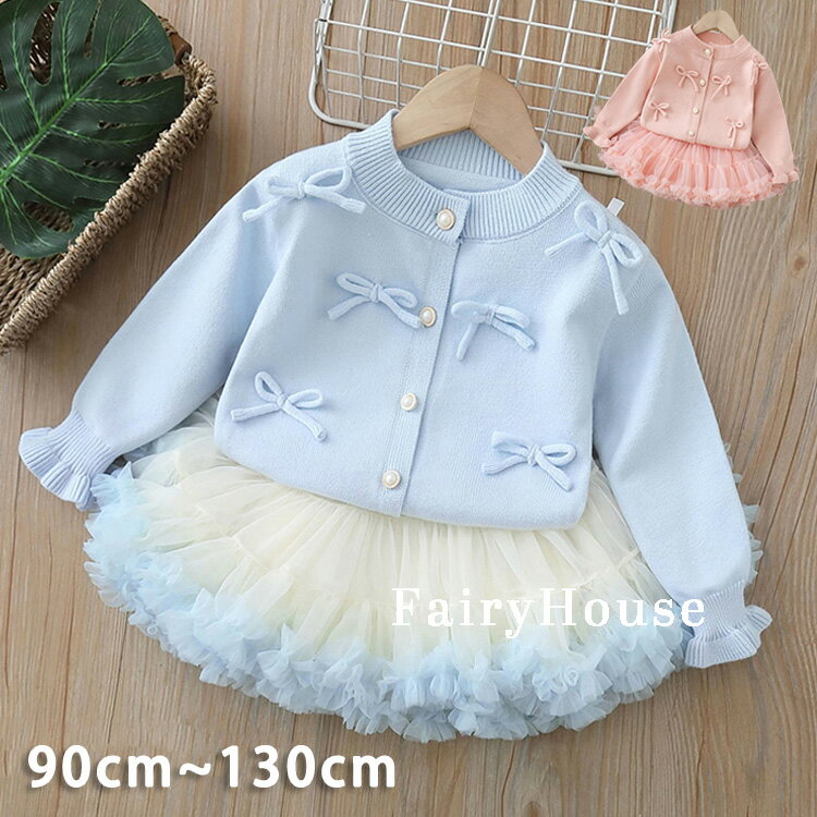 ・カテゴリ: キッズセットアップ・性別: 女性・スタイル: フェミニン・セットアップタイプ: スカートセット・セット点数: 2点セット・対象年齢: 3〜8歳・袖丈: 長袖・生地: ニット・主な素材: ビスコース70%・厚み: 普通・生地加工: 柔軟加工、酵素洗・留め具: シングルボタン・要素: セットアップ、カーディガン、リボ...