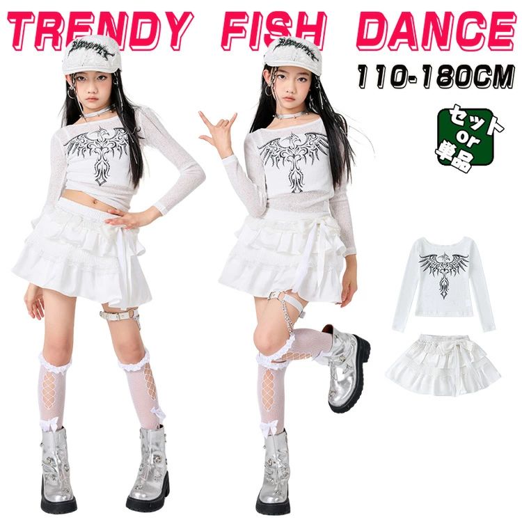 白 キッズ ダンス衣装 ヒップホップ 子供 スカート 舞台用 長袖トップ セッ...