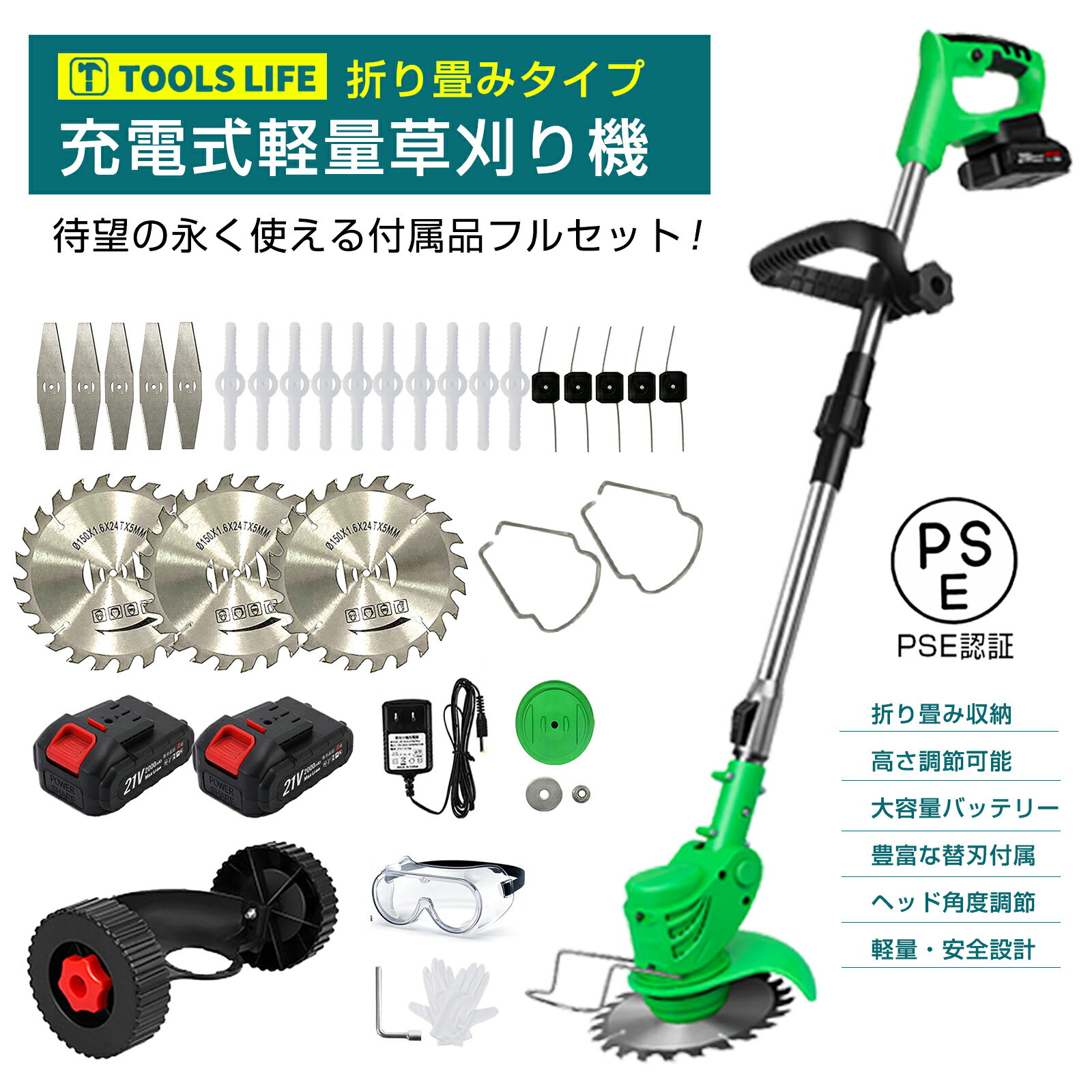 TOOLS LIFE 充電式草刈り機 バッテリー式 折り畳み式 3種類替刃 専用補助輪...