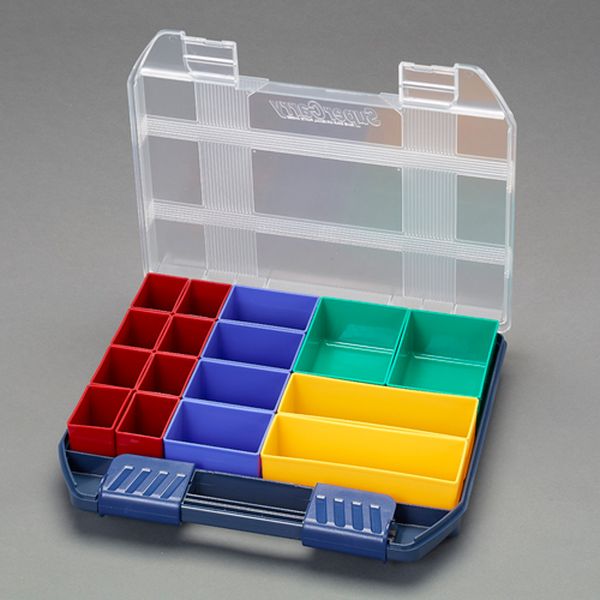 サイズ(mm):424×375×72(H)トレー:赤:8(個) 青:4(個) 緑:2(個) 黄:2(個)材質:本体:超高耐衝撃ABS樹脂 SPBOX:高耐衝撃性コーポリマーカラー:クリア/ブルー重量:2kgバックルはスーパーロック方式でロックかけ忘れによる中身の飛び出しを防ぎます収納物が取り出しやすい底部アール加工付。小箱(SPボックス)替ト...