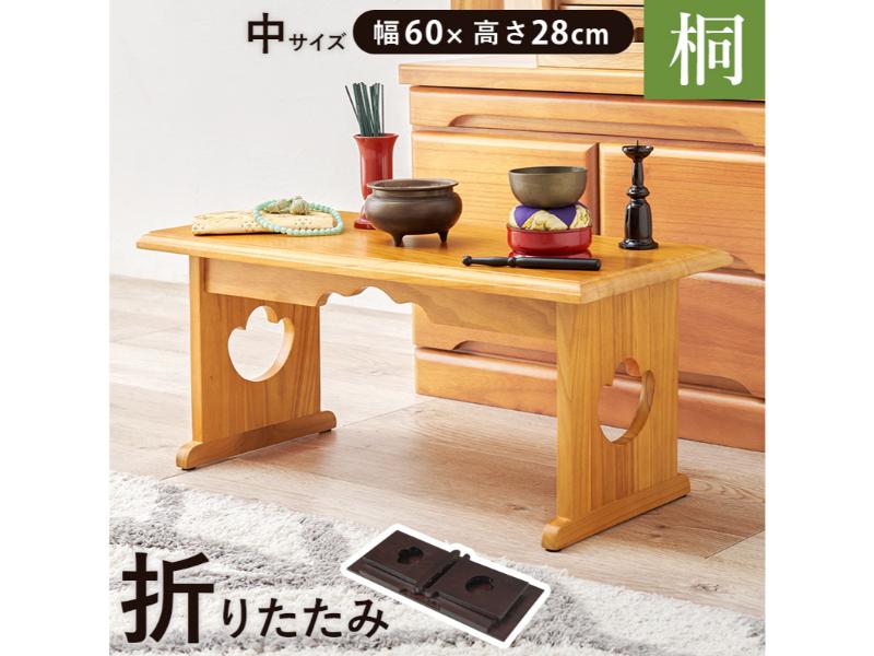 コンパクトに収納できる折り畳み式。日常使いの仏具を置いたり、軽くて持ち運びやすいのでお供え物を頂いた時などにサッ広げたりして使えます。 ナチュラル (約)幅60×奥行27×高さ28cm ■折りたたみ式 主材:桐材 中国製