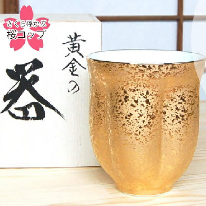 【サイズ】径8.2cm×高さ9.6cm ◇材質:磁器 ◇生産地:日本(有田焼) 有田焼の湯呑「ジパング(大)桜湯呑」は、黄金色に輝く華やかなデザインが特徴の逸品です。 器の内側にお茶を注ぐと、水面に桜の花の形が浮かび上がる特別な仕掛けが施されています。 高級感のある金色の外観は、贈り物やおもてなしにも最適です。 磁...