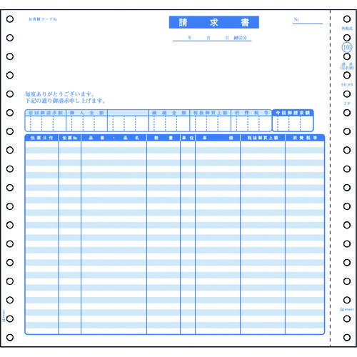 ベストプライス版 請求書(品名別) 2P 2つ折りにすると長形3号窓付き封筒にぴったり入ります。 その他の伝票はこちらから サイズ 241×229mm 入数 500セット ミシン目切り離し後のサイズ 224×229mm 複写枚数 2 項目名 1,請求書;2,請求書