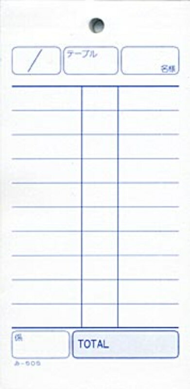 単式伝票です。■ 基本仕様複写枚数単式サイズ(縦x横)133x64mm行数11ページ数100ミシン目なし通しNo.なしテーブルNo.あり名様・人様あり担当者・係ありおあいそ票なし品名入りあり紙色白刷色紺