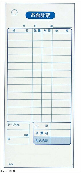 製本せず、100枚ごとに裏ボール紙が入って糊付けされたタイプのお会計票●お会計票●用紙色:白●単式●通しナンバー入(001〜100)●No.位置:伝票右下●1穴付き●1枚サイズ:70×150mm●製本:バラ(セット伝票)●入数:500枚●包装形態:紙箱入JAN:4902668080683
