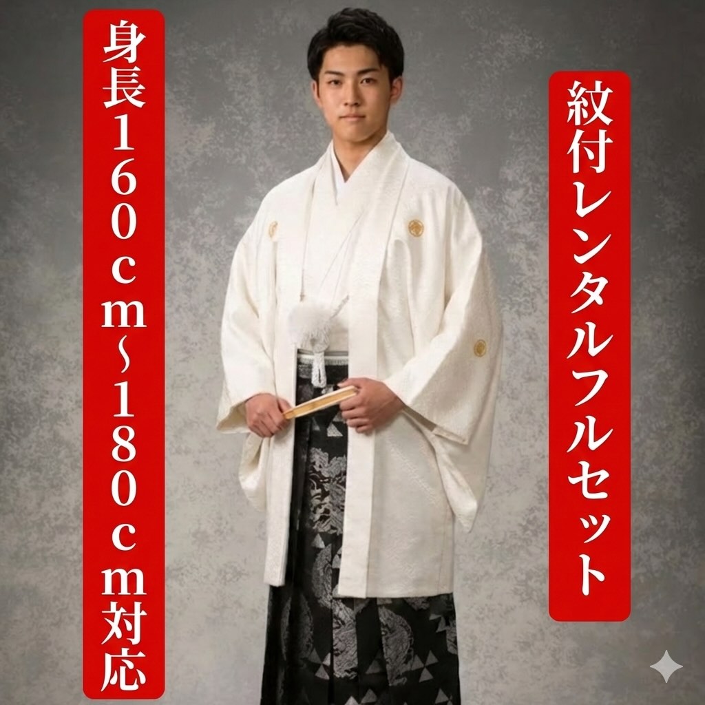 【白:黒龍】【紋服レンタル】【着物レンタル】【紋付袴レンタル】【紋服フルセット】【紋付き】【男物羽織袴】【結婚式】【新郎衣裳】【成人式衣裳】【卒業式衣裳】【送料無料】【成人式レンタル】【結婚式レンタル】 レンタル衣装・紋服衣裳フルセット(往復送料無料) 新郎衣裳 表地・裏地(合成繊維) サイズ160セ...