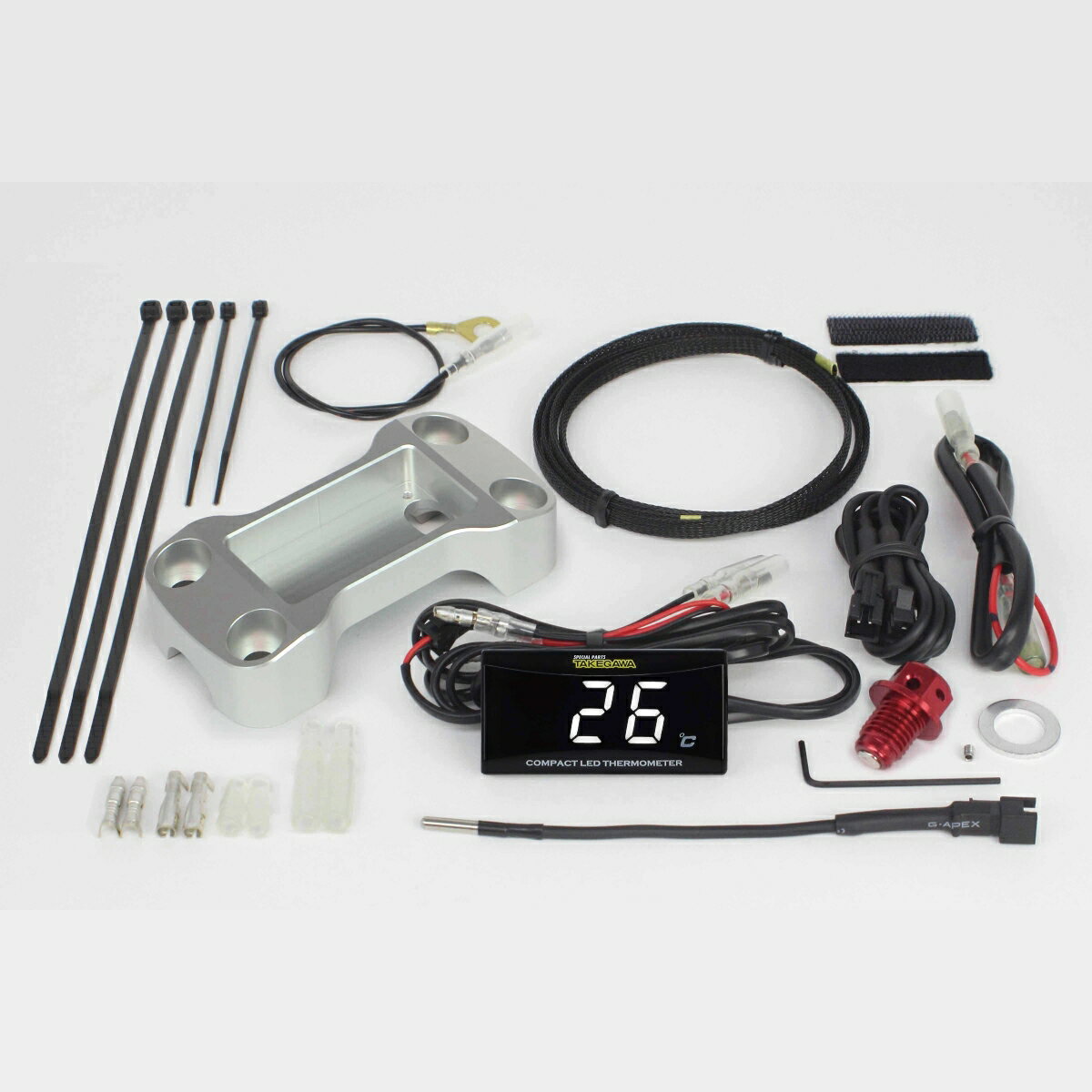 本製品はコンパクトLEDサーモメーターキット内にある専用設計のビレットハンドルクランプを装着することで、ハンドルクランプ内にサーモメーターを収納出来ます。これにより、スピードメーターを邪魔することなくサーモメーターが収まり、ハンドル周りを美しくまとめます。 又、キットには配線加工の必要が無いサブハー...