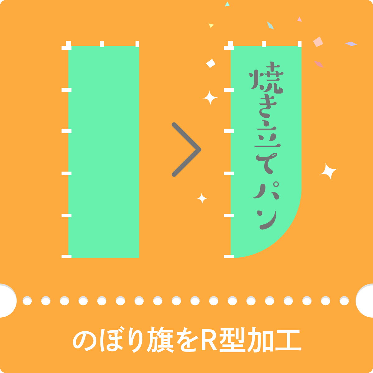 デザインそのままステキを追加。「雰囲気を変えたい」、「ちょっと変わった感じが欲しい」そんなときは角を少し丸くするだけで洋風にも合うオシャレなのぼりの出来上がりです。はためき方もかわります。デザインのイメージはそのままで右下の部分にRカットを施します。角が無いので、はためき方が変わり、同じのぼり旗の...
