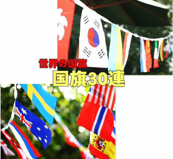 国旗30連 万国旗30ヶ国分が連なってます。 さまざまなイベントの演出にオススメ!! カラフルな30連の国旗は、 運動会やパーティなど、イベントを華やかに演出します。 店舗装飾にもどうぞ。 【国旗内訳例】 ・日本・アメリカ・イギリス ・中国・スイス・フランス ・イタリア・カナダ・ロシア ・オーストラリア・ドイツ...