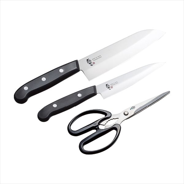 《 商品の説明 》 ・燕三条の職人による手仕事で仕上がりました。 ・サビに強く、切れ味が持続する、お手入れがしやすいステンレス刃物鋼を使用しています。 ・衛生的な樹脂製ハンドルを使用。 ・三徳包丁は野菜、肉、魚と多用途に使える万能包丁です。 ・ペティナイフは野菜や果物の皮を剥く、野菜の面取り、肉や魚を捌...