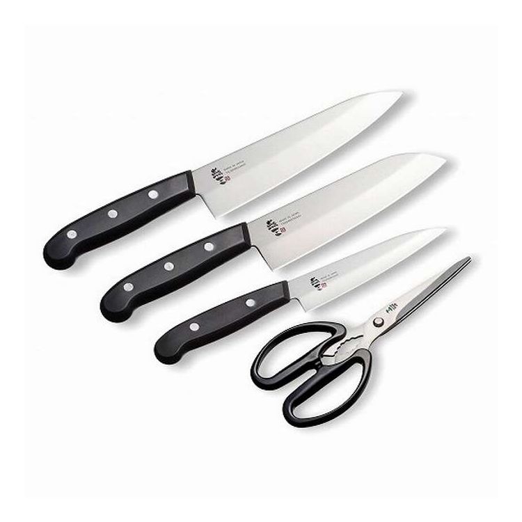燕三条の職人による手仕事で仕上がりました。日本製【セット内容】-サイズ:牛刀包丁:刃渡り18cm、三徳包丁:刃渡り16.5cm、ペティナイフ:刃渡り13cm、キッチンハサミ:全長約19cm重量/容量:-箱サイズ:35×27×2.4cm材質:刀部:ステンレス刃物鋼、ハンドル:ポリプロピレン・ナイロン、ハサミ:ステンレス刃物鋼・ABS樹脂【...