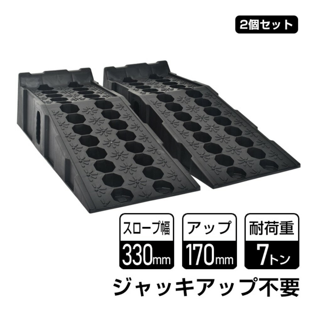 ジャッキ不要で170mmアップ2本で耐荷重約7トン大型車も対応330mmの幅広スロープ傾斜角17度のフラットスロープスリップ防止加工もバッチリ底部にも滑り止めゴムキャップ付き高さ50mmのタイヤ止め【商品内容】:カースロープ2本セット【サイズ】:(約)330mm×905mm×215mm【重量】:(約)1個 4.85kg/2個 9.7kg【素材】:ポリ...