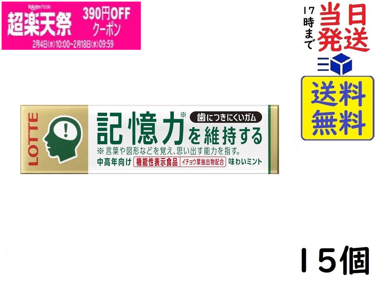 ロッテ 歯につきにくいガム板(記憶力を維持するタイプ) 9枚×15個賞味期限2027/02 【送料無料】【当日発送】【ポスト投函】 歯につきにくいガム板(記憶力を維持するタイプ) 9枚機能性表示食品。イチョウ葉抽出物を配合しており、イチョウ葉抽出物には中高年の方の認知機能の一部である記憶力(言葉や図形などを覚え、思い...