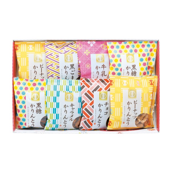 ギフト対応【送料無料】■商品名:かりんとう詰合わせ■セット内容:黒糖かりんとう45g・ピーナッツかりんとう45g各2、牛乳かりんとう45g・チョコかりんとう45g・黒ごまかりんとう45g・キャラメルかりんとう45g各1■加工地:日本■箱:約37×23.5×5.5cm(化粧箱)■食品アレルギー:小麦・乳・落花生※商品情報等が変更になる場...