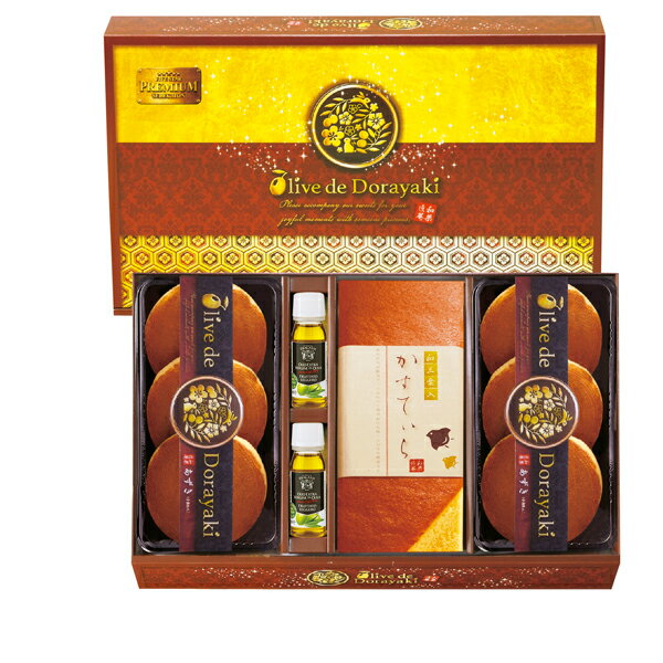 ギフト対応【送料無料】■商品名:和菓匠菴 「オリーブ de どら焼き」Premium NODE-CB54■商品:どら焼き(あずき)×6・和三盆糖入かすてぃら(プレーン)1本・オリーブオイル18g×2 【卵・小麦】■商品重量:840g■温度帯:常温■賞味期間(製造日から):60日間■生産国:日本■箱:約220×365×55mm※実際にお届けするかすてぃら、...