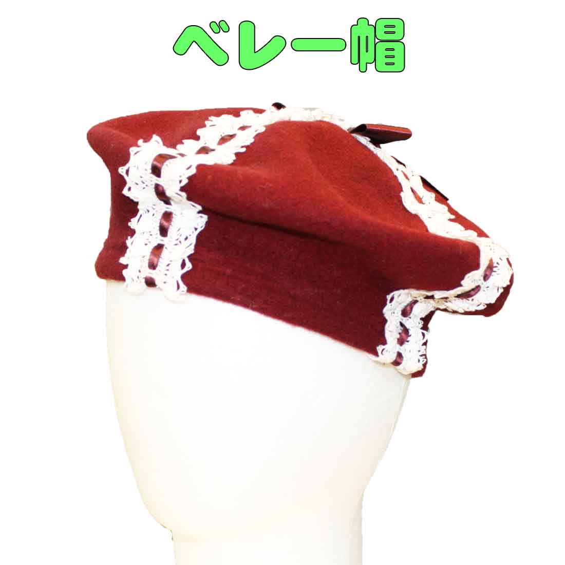 こども帽子 ベレー帽子(ワインレッドにレースとリボン) 子供用 秋物 おしゃ...