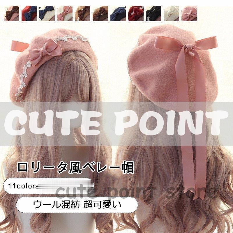 ロリータ風ベレー帽 レディース 帽子 無地 ウール混紡 リボン付き もこもこ ...