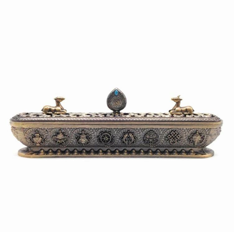 とても珍しいチベット式の長細いボックス型の香炉です。 容器の側面片側には八吉祥と呼ばれる物がデザイン、もう片方はチベット文字がデザインされています。 蓋にはチベット寺院のデザインによく見られる、二匹の鹿と法輪モチーフ付きです。 珍しい工芸品風の置物として飾っておかれるのも良いですね。 アジアン風のお...