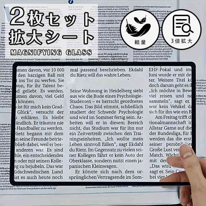 【品 番】aigehw01 【サイズ】約180×120×0.5mm 【素 材】PVC 【内 容】2枚セット 【POINT】 長方形拡大シートは拡大したいページをより大きくカバーし、表示できます。常に手を動かす必要はありません。 柔軟性のあるPVC素材を採用、軽量で柔軟性があり、読書時間を長くして持ち運びに便利です。