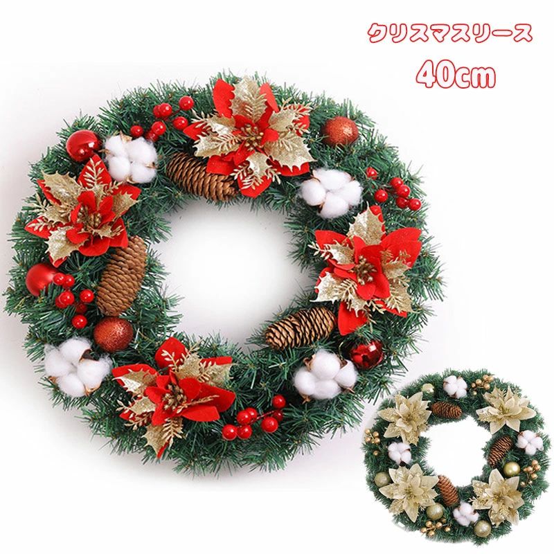 おすすめ商品はこちらへクリック商品説明商品名:クリスマスリースセット内容:クリスマスリースのみ材質:PVC素材カラー:写真ご参考サイズ:直径約30/40/45cm製造国:中国(日本検品済み)商品特徴数種の杉と木の実を合わせて、立体感が出るように仕上げています。玄関先にひとつ飾るだけでとてもおしゃれな雰囲気にな...