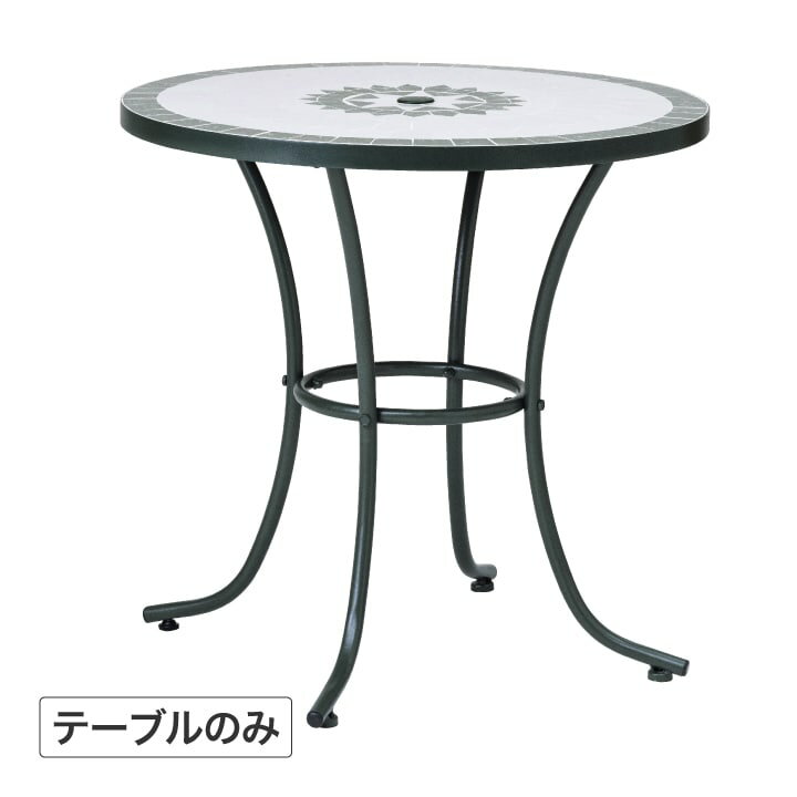■商品名:タンジール モザイクテーブル マットグリーン ■商品コード:56890100 パラソル穴付き。華やかなモザイクタイルテーブル 【商品詳細】 サイズ:約幅76cm×奥行き76cm×高さ72cm 重量:約26.7kg 材質:[フレーム]スチール[天板]タイル 備考:[パラソル穴]約直径4.2cm [本体組立時間]20分未満 [組立必要人...