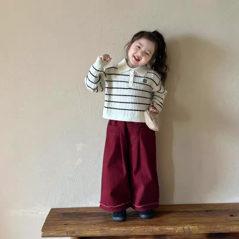 ・カテゴリ: 子供用セーター・対象: 女児・スタイル: 韓国風・対象年齢層: 中小 детски(3~8歳、100~140cm)・シーズン: 冬、秋・毛糸の太さ: 普通・厚さ: 厚手・袖丈: 長袖・留め具: プルオーバー・柄: ストライプ・素材: 綿80%・安全レベル: B・襟型: 折り襟・フード: なし・色: ストライプセーター、赤色パンツ・その他...