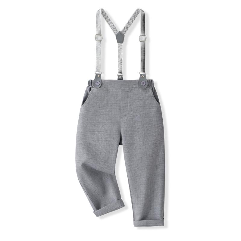 ・性別: 男の子・スタイル: ブリティッシュ・カテゴリ: パンツセットアップ・対象年齢: 3〜8歳・袖丈: 長袖・パンツ丈: ロング・加工: 柔軟加工・厚さ: 普通・柄: 無地・要素: サスペンダー、蝶ネクタイ・素材: 綿98%・前開き仕様: シングルブレスト・カラー: グレー・サイズ: 9-12M、1-2Y、3-4Y、4-5Y、5-6Y、7-8Y