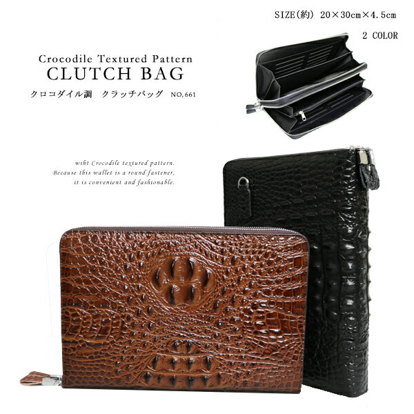 メーカー希望小売価格はメーカーカタログに基づいて掲載しています。 クロコダイル調 クラッチバッグ クロコダイル型押しの圧倒的存在感。年齢を問わず支持されているクロコダイル柄。 デザイン性と使いやすさにこだわった魅力ある逸品です。 しっかりとした作りで大きさも十分で収納力も抜群です。 深さがあるので薄手...